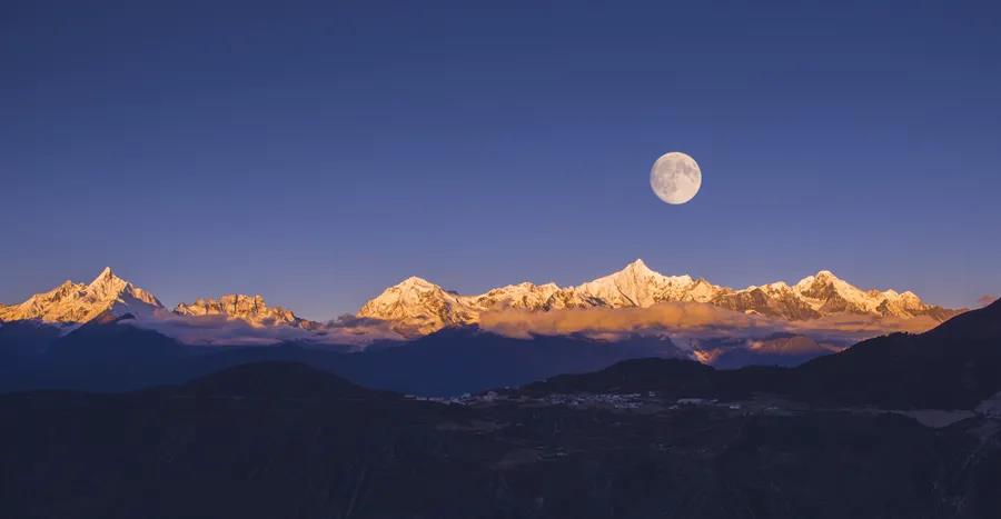 梅里雪山、白马雪山、玉龙雪山、萨普神山……在绝佳观赏地拍摄秋色中的日照金山。