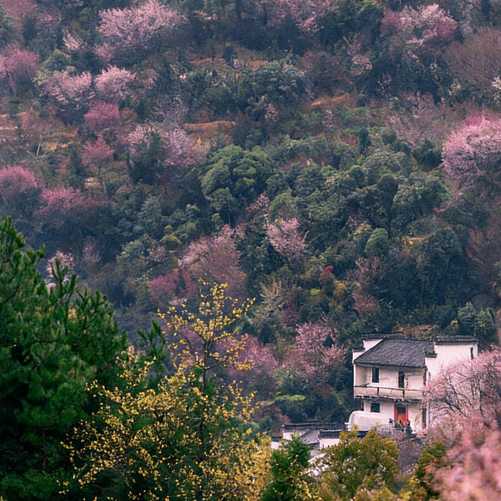 藏匿于山谷,与青山相辉映,放眼望去,花开烂漫、山翠梅艳、风光旖旎,别有一番韵味。
