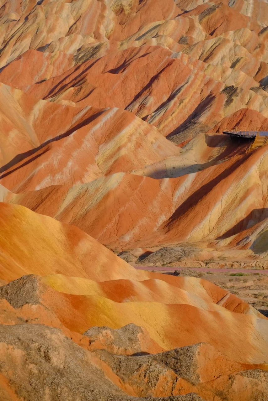 🔹看什么:茶卡盐湖的镜⾯倒映粉橙⾊晚霞, 张掖丹霞的岩层像上帝泼翻的油画颜料。