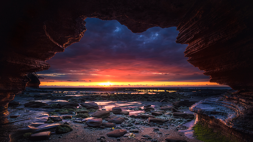 火山岩层长年受海浪侵蚀,形成独特的丹红色崖壁,海水顺崖壁滴落如珠帘。这里是观赏日落的绝佳之处,退潮后可直达火山口公园,感受 “一半火焰(岩)一半海水” 的震撼。