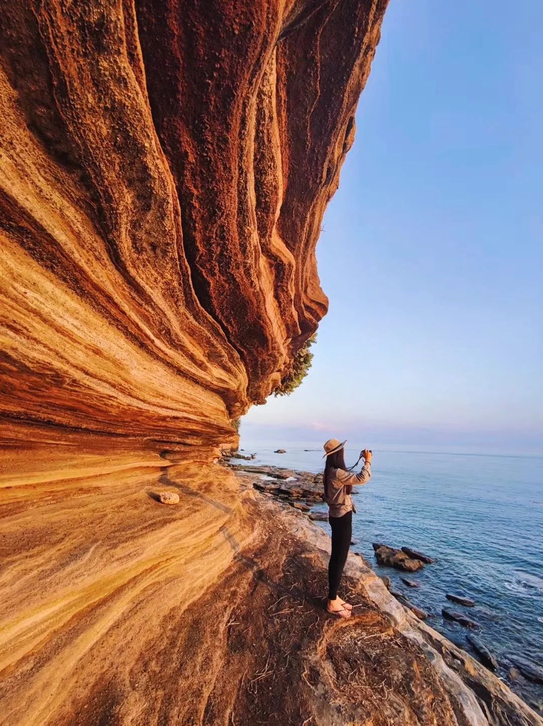退潮后露出国内罕见的 “三叠地质景观”,火山岩滩上的青苔与海水形成五彩镜面,日出时分朝霞倒映其上,堪称摄影天堂。农历初一、十五大潮日景观更壮观,还能顺带体验赶海挖沙蟹、贝类的乐趣。