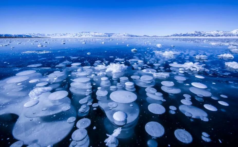 晶莹如玉的赛湖蓝冰,冰冻出成串的冰泡