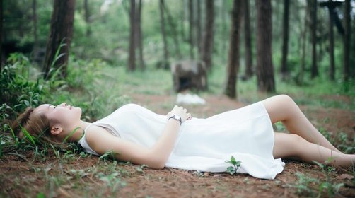 斜阳洒落在丛林之中,悠然宁静,游女郎如同林中精灵,翩然起舞,此时利用大光圈镜头虚化背景,即可拍得梦幻唯美的森系作品。