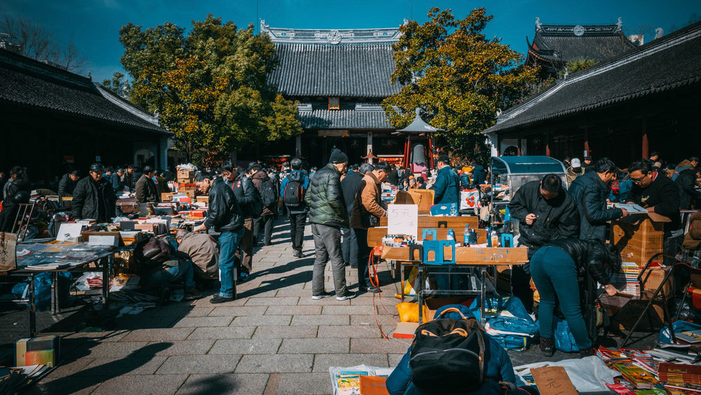 旧书交易市场:从1986年开始,每逢星期天,大成殿前广场上会进行旧书交易活动。进入九十年代,文庙旧书市逐渐成为上海最著名的旧书市场。文庙整修期间,在文庙东北部,尊经阁以东专门划出一片“文庙书刊交易市场”,使图书交易更加繁荣。此外,还沿老道前街、梦花街和学宫街三面的围墙建造起与文庙建筑风格一致的仿古建筑,作为经营古玩、书画等的商店。