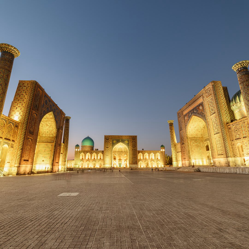 抵达后特别安排【夜游雷吉斯坦建筑群(外观)】撒马尔罕ZUI著名的地标,由三座神学院和广场组成被称为“撒马尔罕之心”。当余晖散去,夜幕降临,雷吉斯坦广场的灯光把恢弘精美的雷吉斯坦建筑群衬得更华丽神秘。