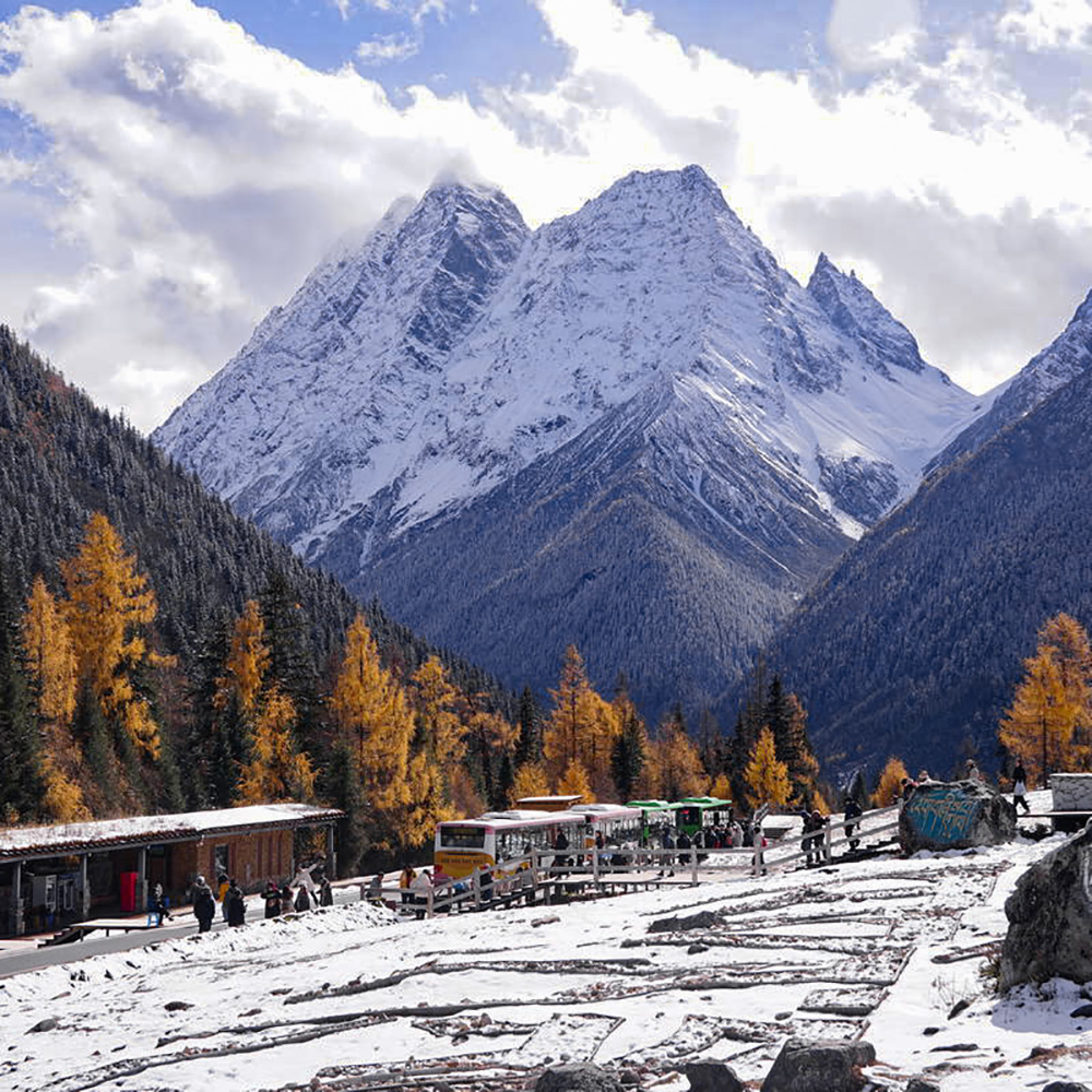 在【双桥沟】沟口换乘景区交通车,开始游览美丽的双桥沟。这里是四姑娘山地区景观集中也是开发完善的区域,景区内可自由选择在适合地点停留拍摄。
