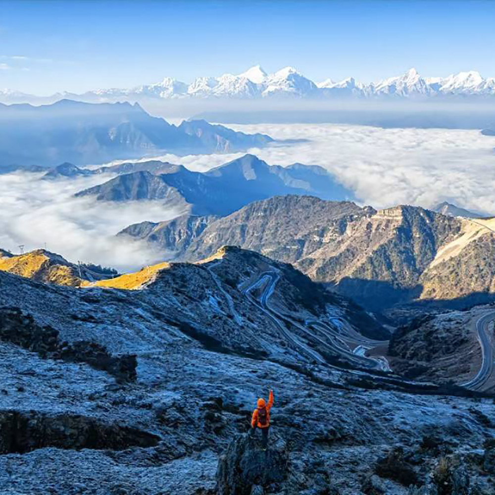 从新都桥出发,前往【牛背山】。2009年底,国家地理杂志著名摄影师无意中在泸定县内发现一片可以观赏到众多雪山的无名山坡,此后以牛背山为名,声名鹊起,八方摄友蜂拥而至。