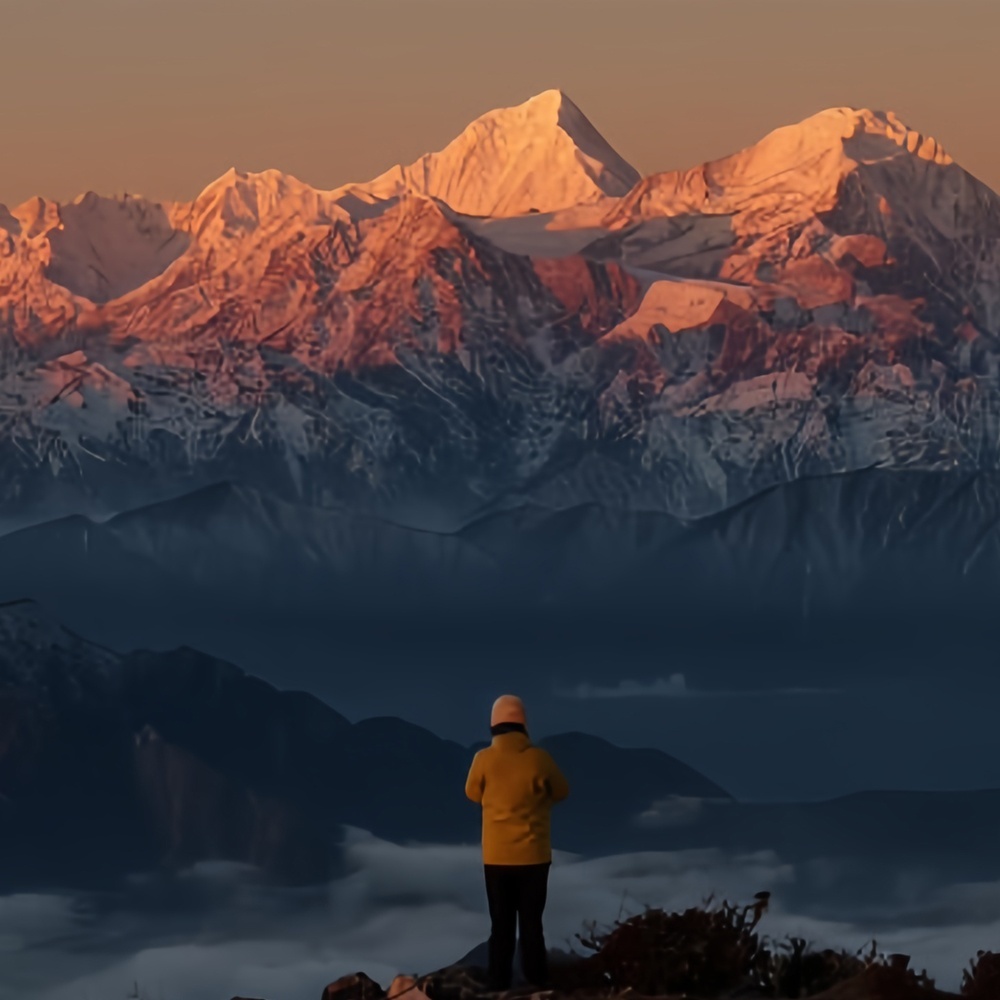 清晨,牛背山就可以观赏拍摄一场贡嘎东坡日照金山,看天空与贡嘎雪山的色彩在短短几分钟内瞬息万变。早上也是山谷间容易形成云海的时间,遇见“海上金山”的奇观。